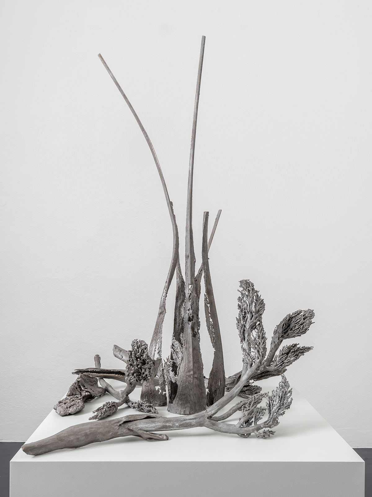 The sculpture, which Szeemann created as part of her exhibition at the Museo Casa Rusca, consists of various elements of the different growth stages of palm trees: young stems, old leaf sheaths, different flowering stages and bracts. The bronze elements, distributed in a circle, resem- ble a silvery charred fire, a ghostly apparition of solidified palm trees. The title of the work Palm Spirits echoes Szeemann’s ongoing interest in the transcendental and spiritual phenomena, or as she describes it, “the fascination with the clicking, rhythmic sound palm fronds make in little or no wind while others stand still, like a Morse code of spirits I want to decipher, and the idea that these bodies act as mediums, vessels for entities from beyond.”